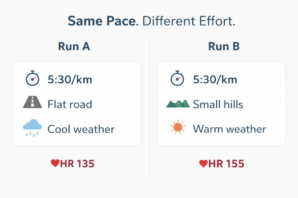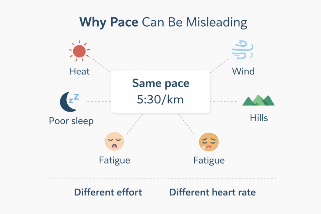 The problem is that pace measures speed, not physiological effort. Two runs with the exact same pace can require very different levels of effort depending on terrain, weather, fatigue, or recovery.